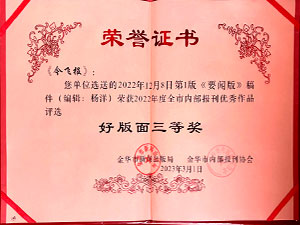 米兰游戏,米兰(中国)报-选送的2022年12月8日第一版《要闻版》稿件(编辑:杨洋)荣获2022年度全市内部报刊优秀作品评选好版面三等奖