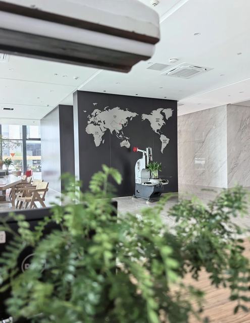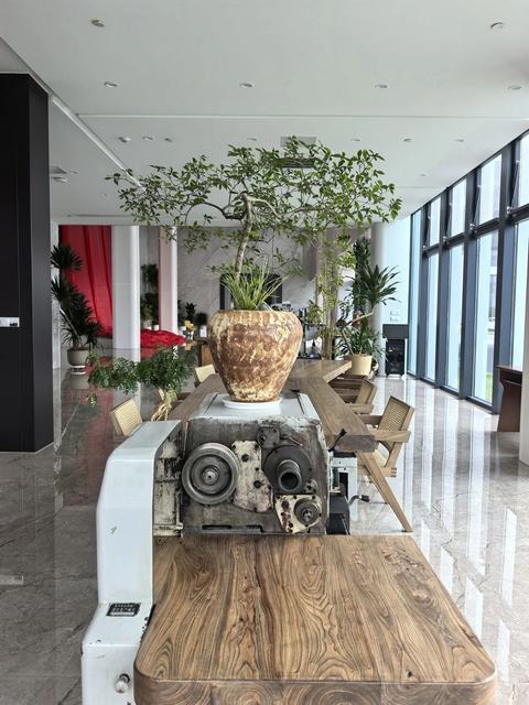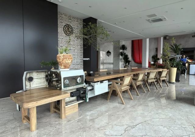 集团总部大楼于2023年6月建设,2024年11月28日进场装修,历时2年的时间完成建设及装修,大楼的设计装修体现了许多“米兰游戏,米兰(中国)元素”,大厅以绿色可持续理念为脉络,将承载时光记忆的60年代老设备巧妙解构重组,让老设备与温润质朴的原木相遇,让带有岁月包浆的机械部件重生为茶桌的艺术支撑,金属的冷冽硬朗与木质的自然温厚相互碰撞,既延续着工业文明的厚重底蕴,又以创新形态诠释着生态与人文共生的美学哲学,让每一处空间肌理都诉说着企业过去与未来的对话。